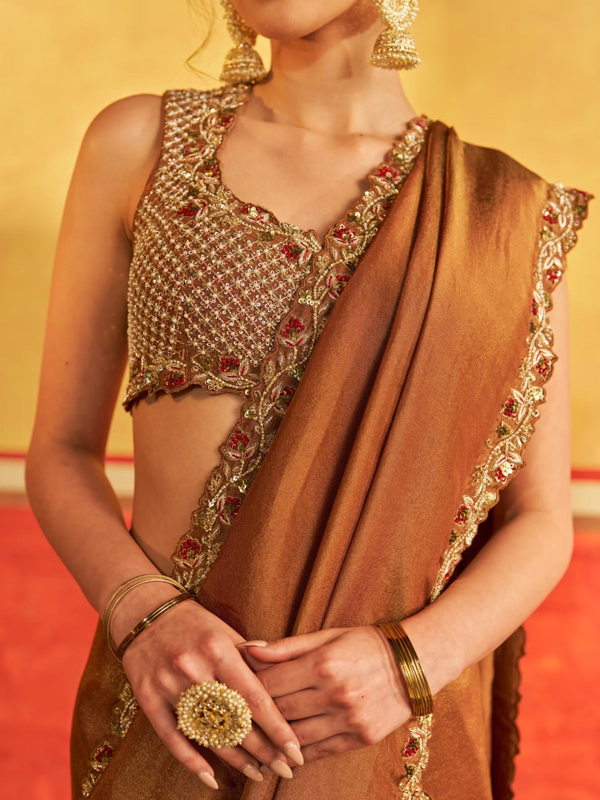 Perfect for weddings, this golden-brown saree showcases intricate cutwork, resham, and dabka embroidery. The pre-draped silhouette with a beautifully detailed blouse brings effortless elegance to your festive style.