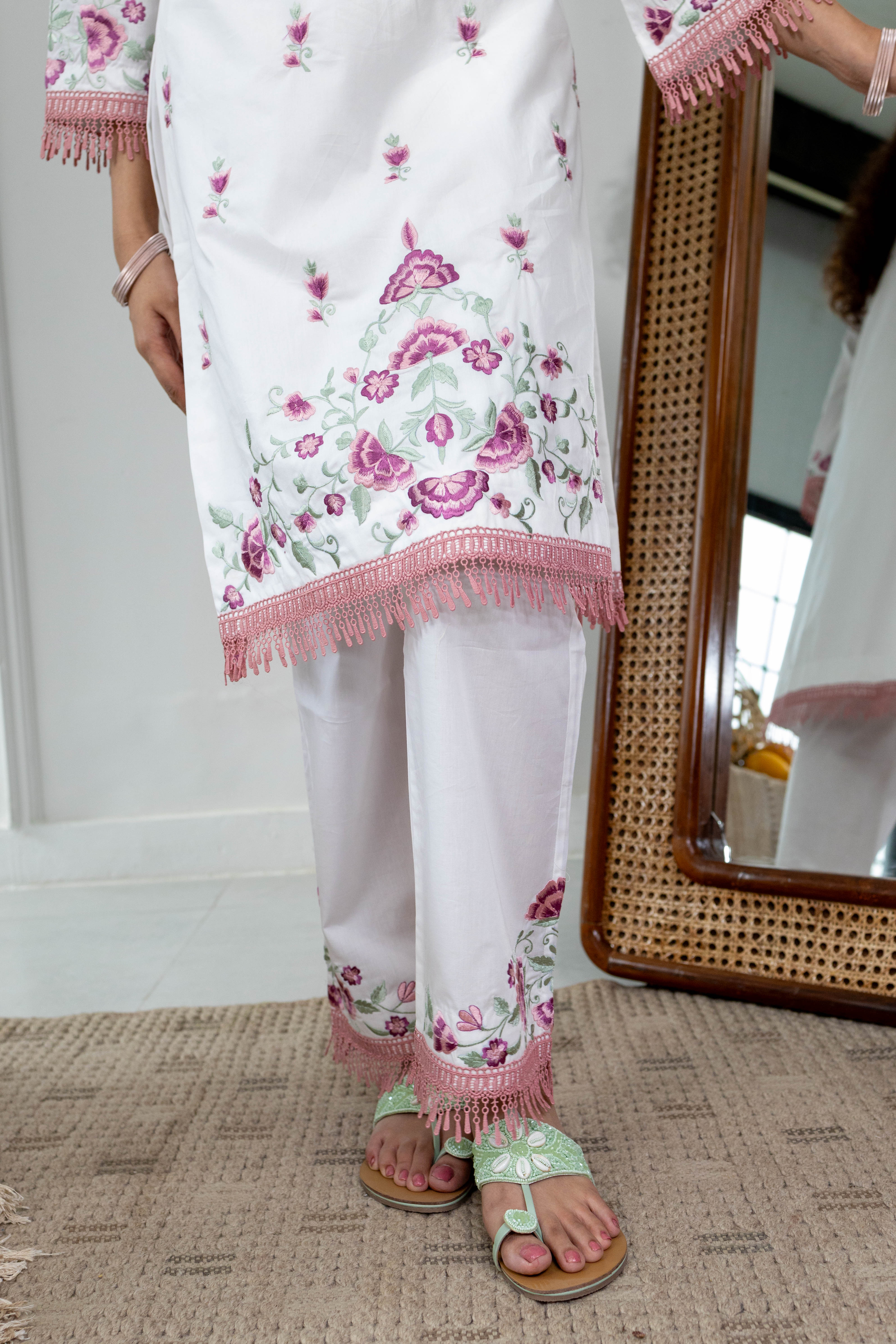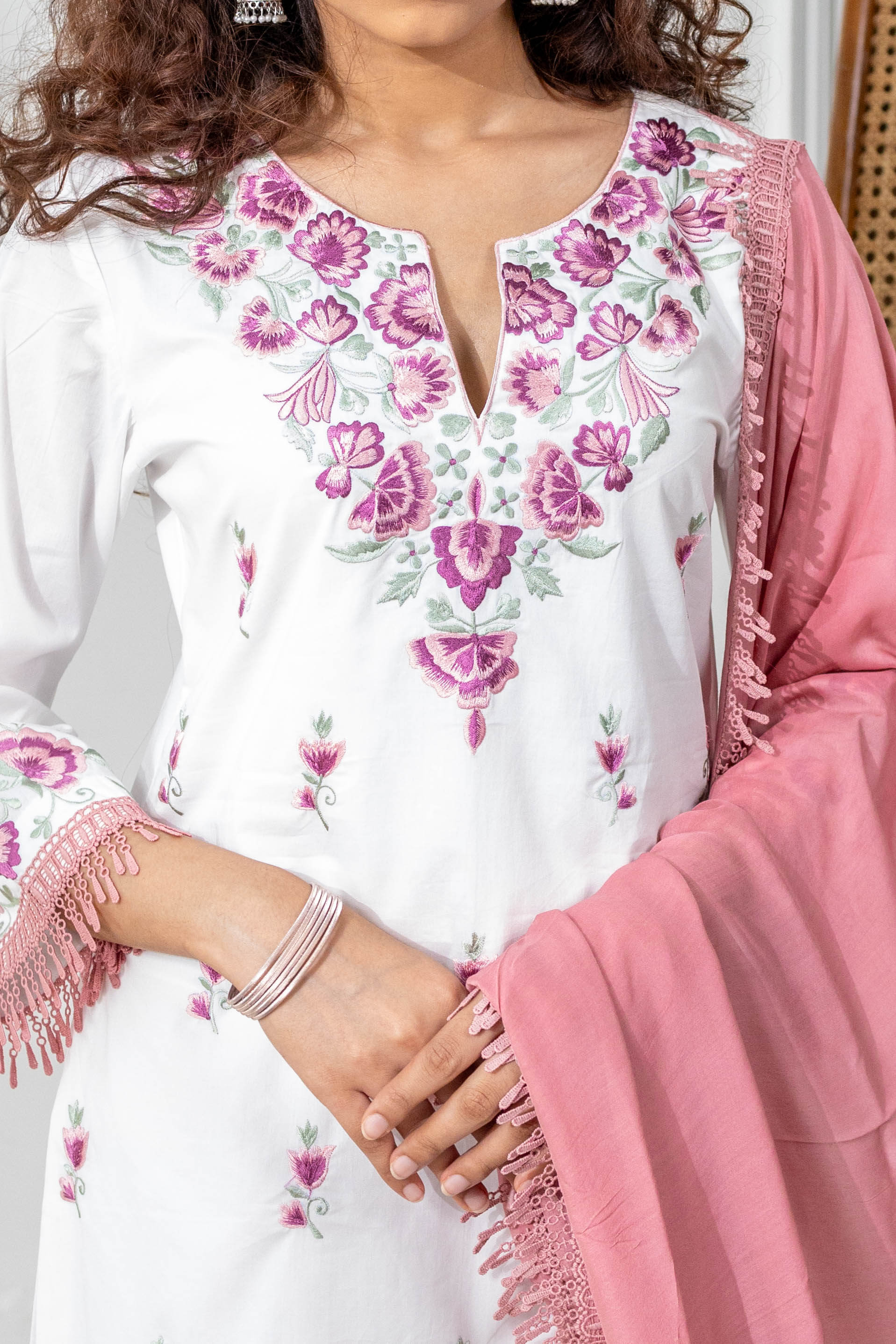 A captivating white cotton silk set brought to life with contrasting pink embroidery that adds vibrant charm. Paired with a pink dupatta adorned with delicate lace detailing, Palash stands out for its unique elegance and effortless appeal.