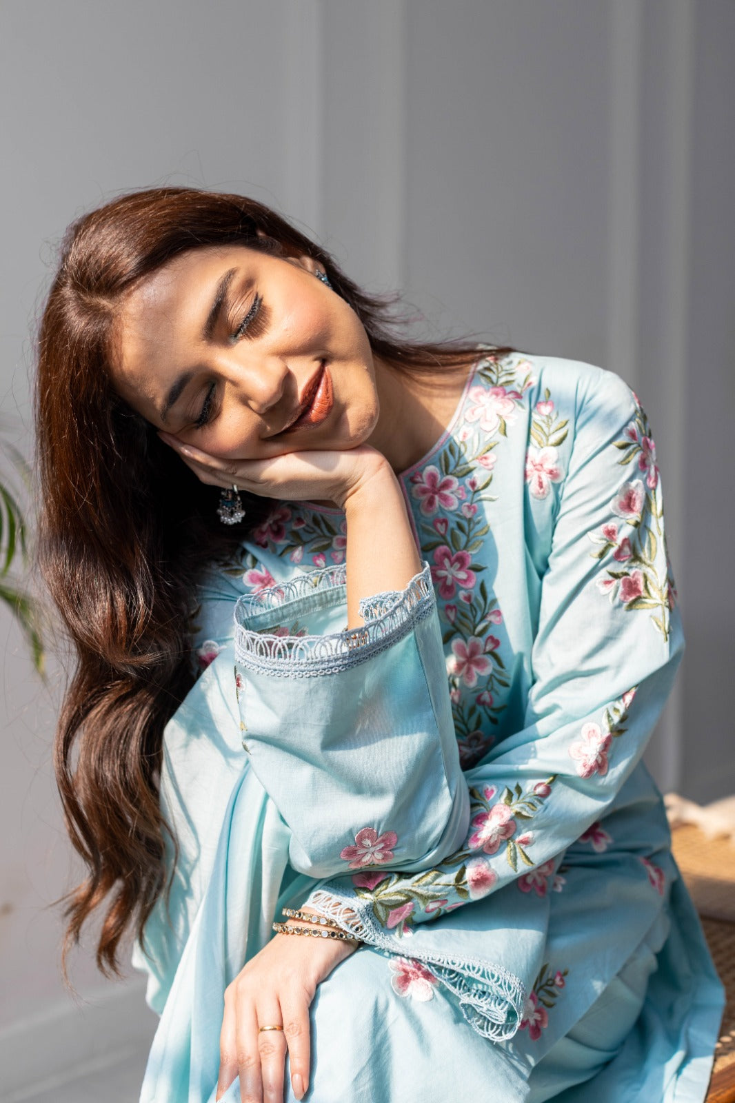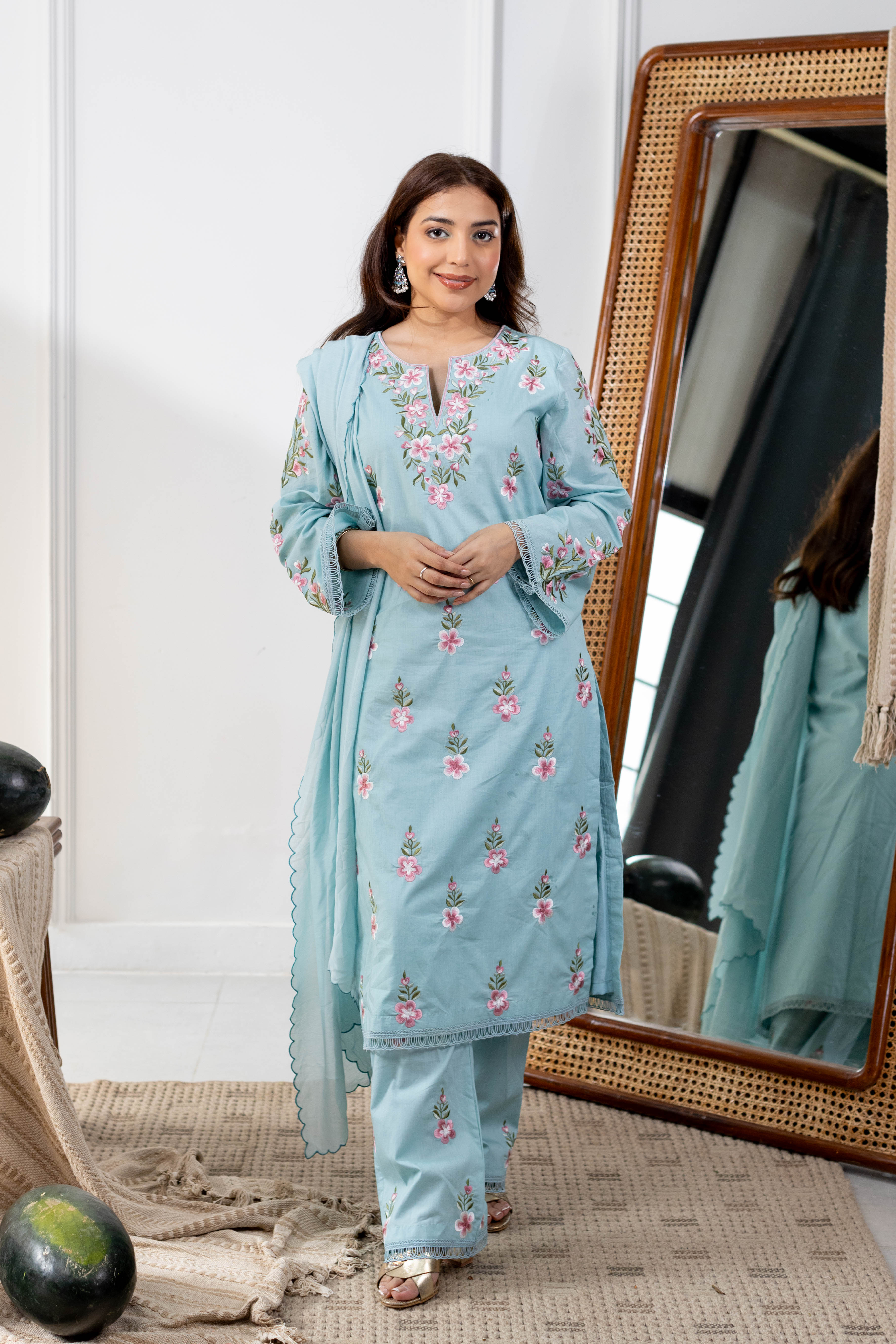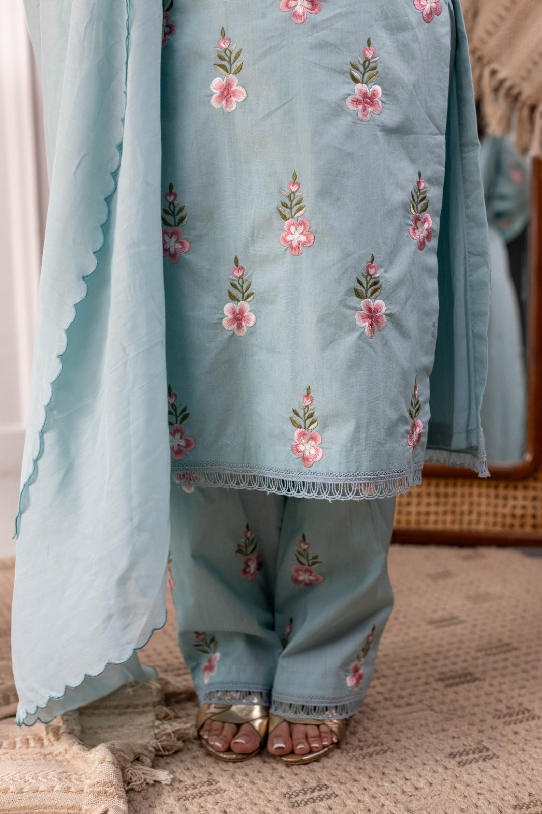 Tulsi is a refreshing ferozi-toned cotton silk set that beautifully balances tradition and charm. The kurta and bottoms are adorned with delicate embroidery in soft pink, white, and green, highlighted with fine lace detailing. Paired with a coordinated cotton silk dupatta, this set captures the essence of effortless grace and timeless appeal.
