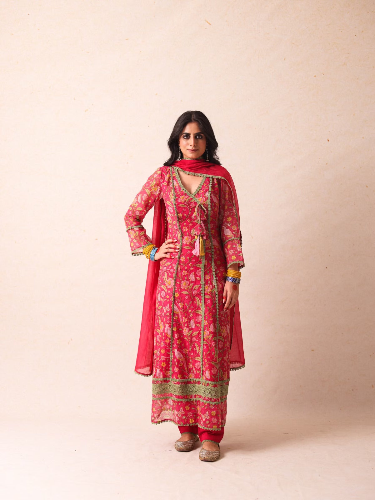 The Jahanvi Pink Angrakha is a delicate balance of grace and heritage. Featuring a lace-adorned Angrakha neckline with tie-up dori and tassels, this Chanderi kurta pairs beautifully with matching pants and a dupatta, making it ideal for festive celebrations.