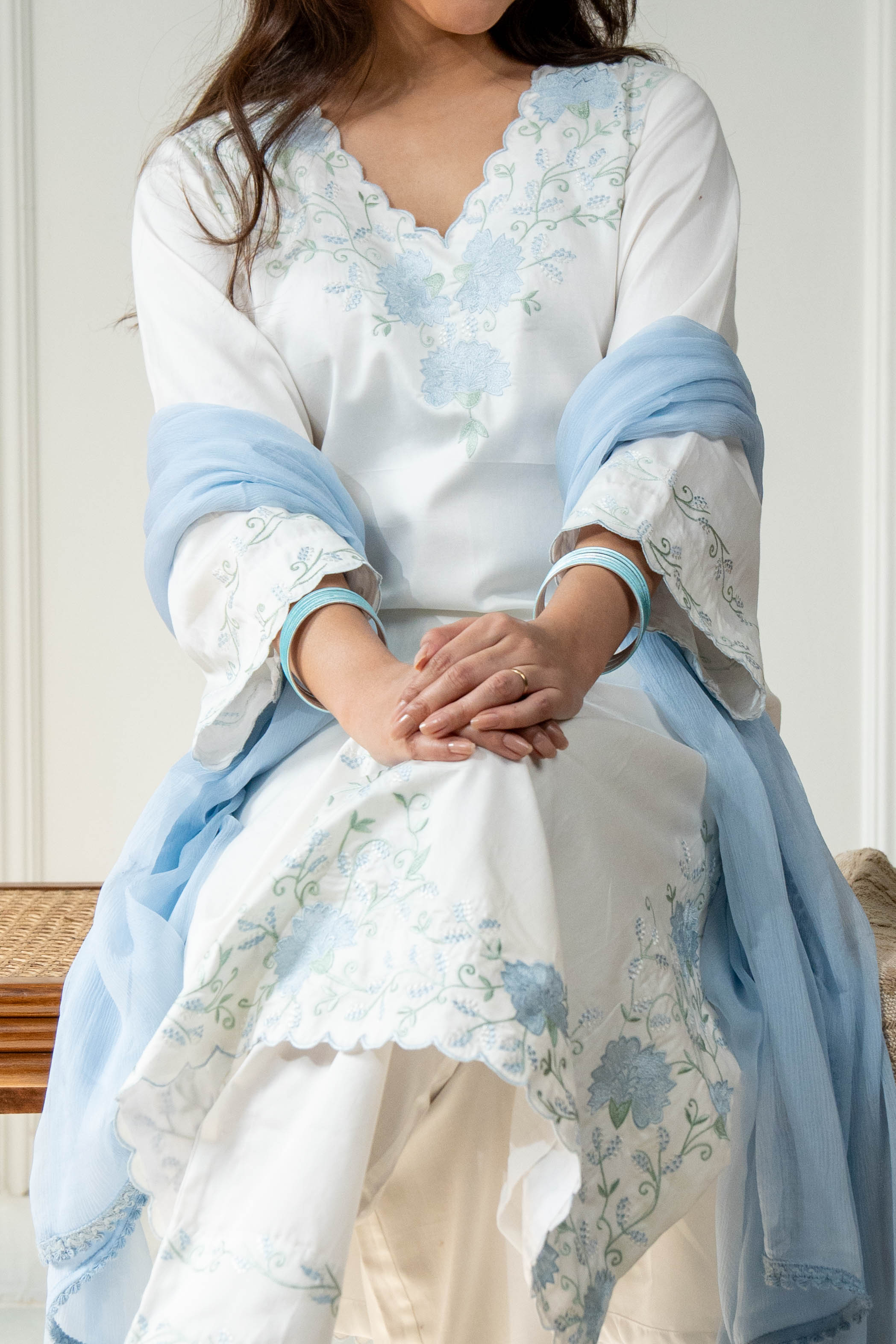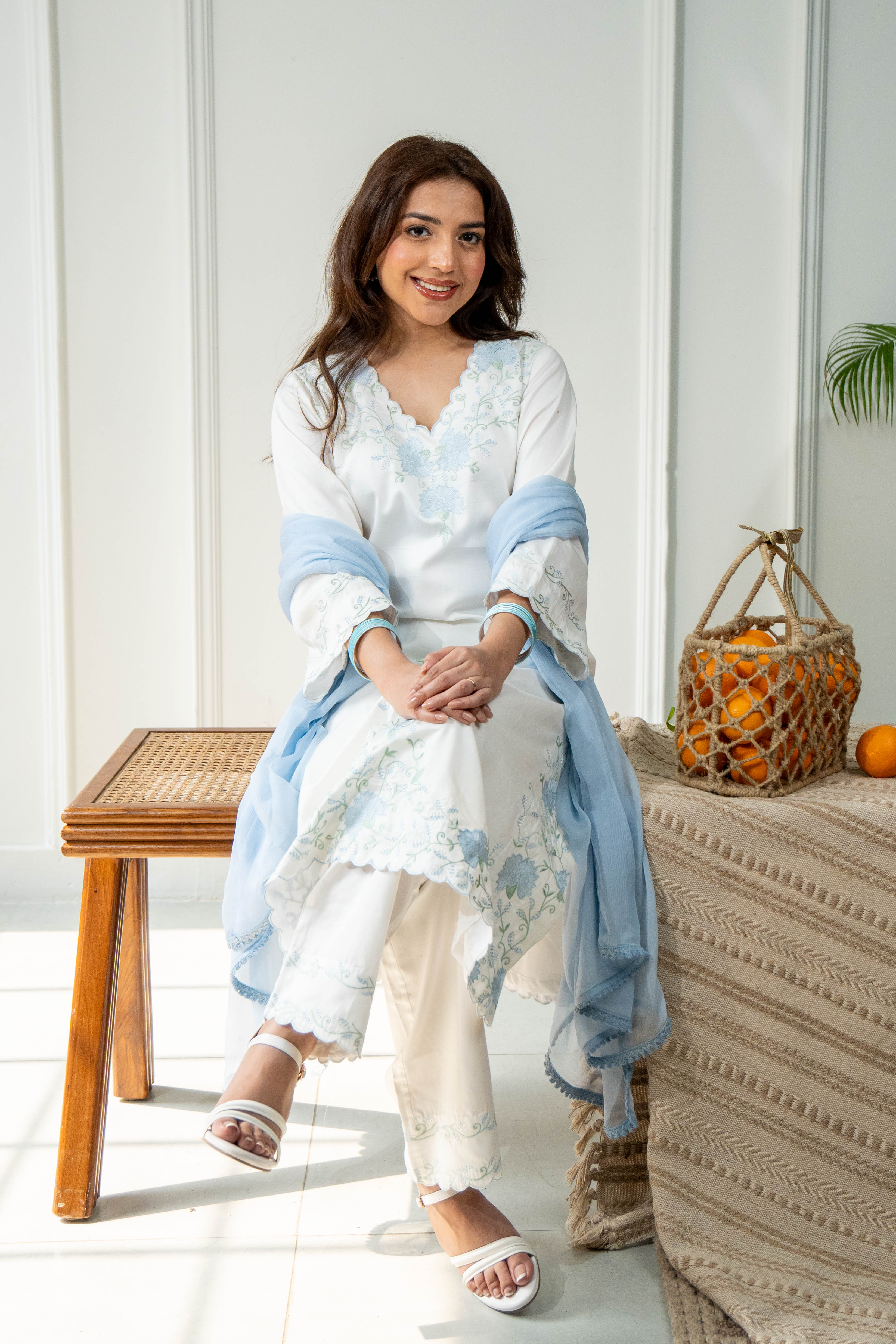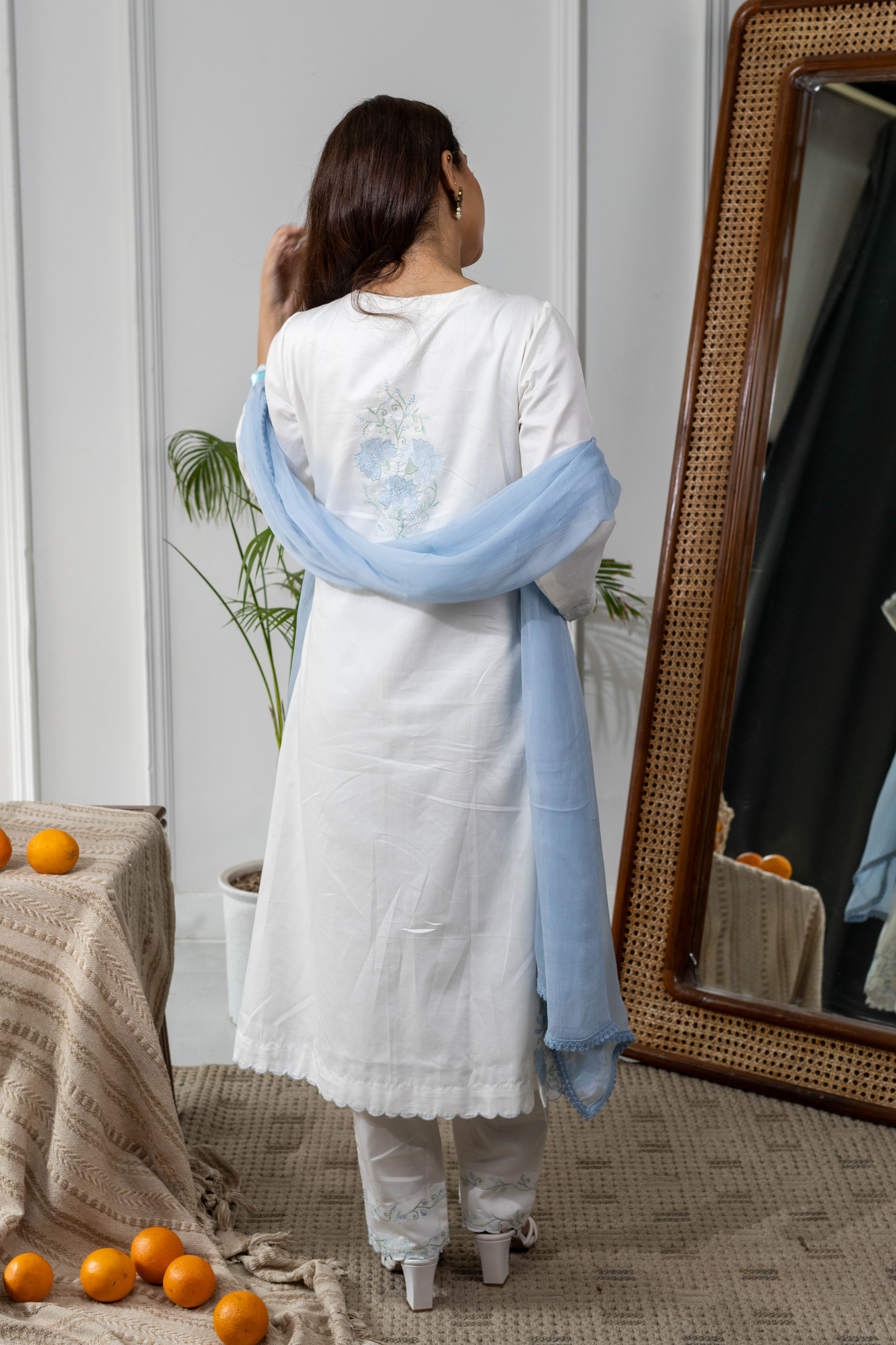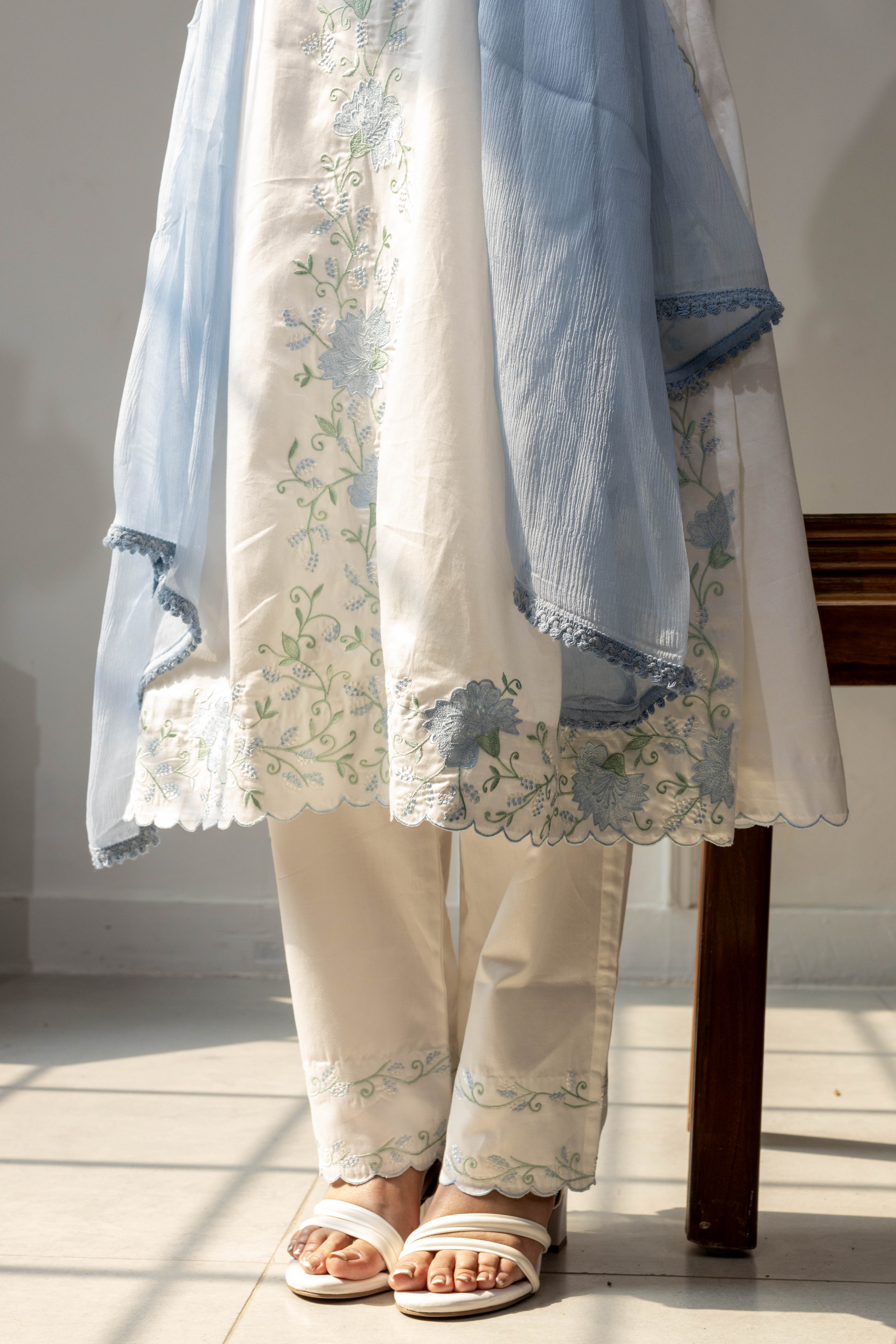 Soft, serene, and effortlessly elegant — Mogra is a three-piece set crafted in breathable satin cotton, paired with a lightweight chiffon dupatta. The white base is beautifully enhanced with delicate embroidery in soothing hues of light blue and green.